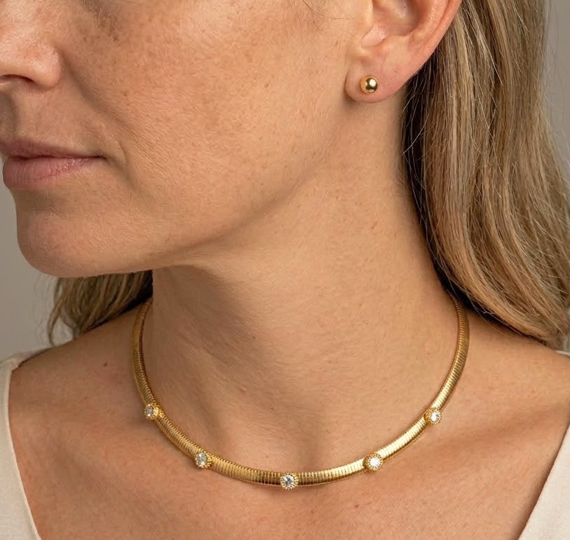 DESCRIÇÃO DO PRODUTO: Colar fita em aço inox banhado com pontos de luz em zircônia. Brinco pino mais tarraxa com base redonda em aço inox banhado.