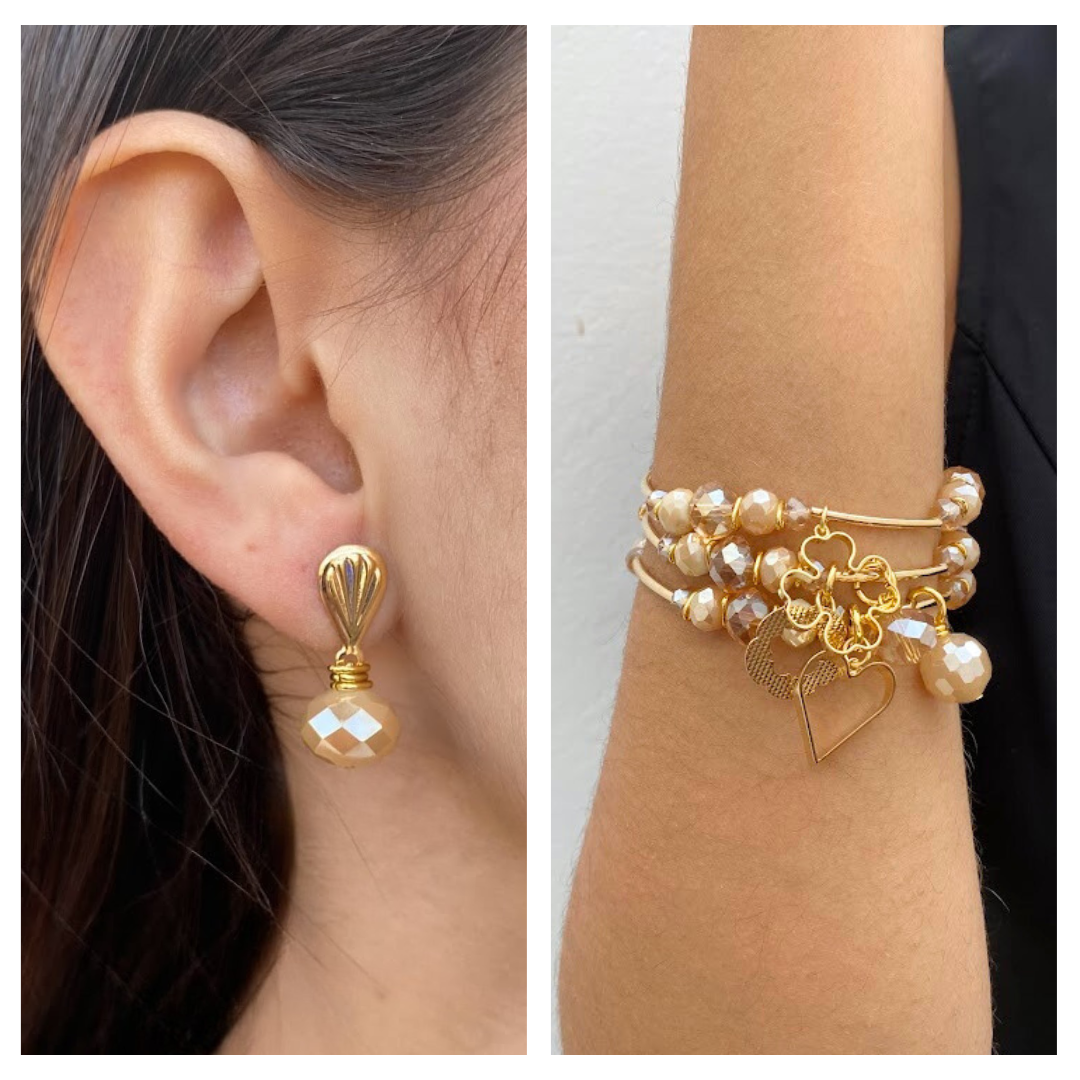 NOME: Pulseira Várias Voltas em Cristal com Pingentes Banhados e Cristal na Cor nude. Brinco pino mais tarracha banhado com cristal em vidro nude