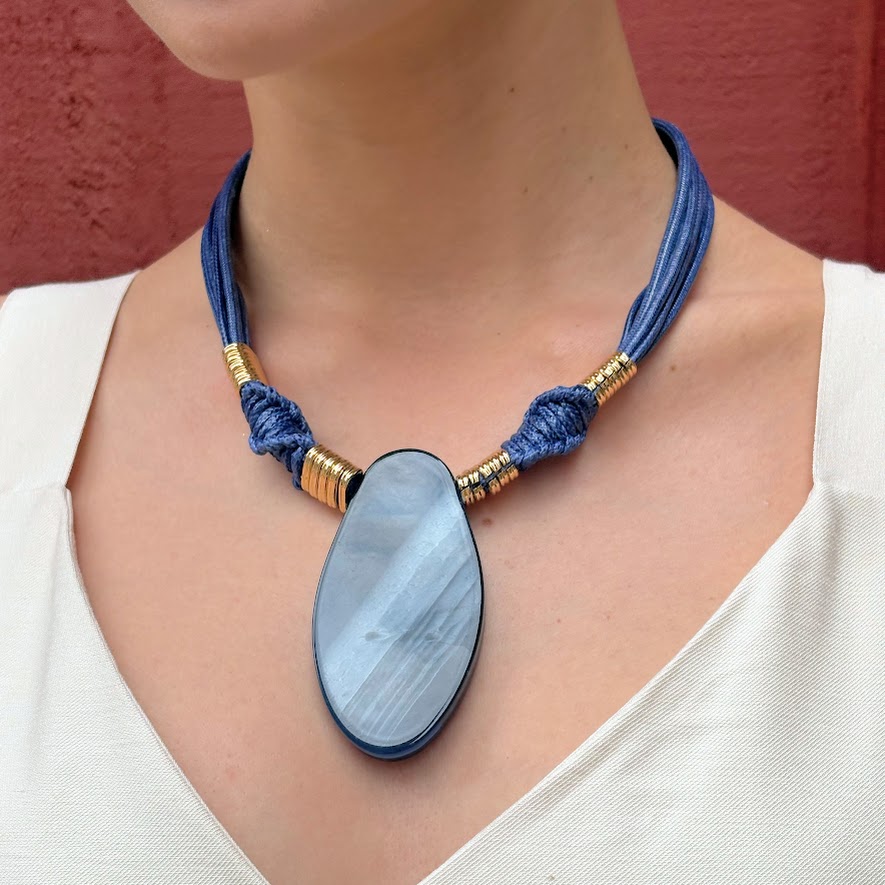 PEÇAS: metais banhados, metais em alumínio leves e resistentes, fio encerado mais pingente em resina no formato oval apresentando nuances.