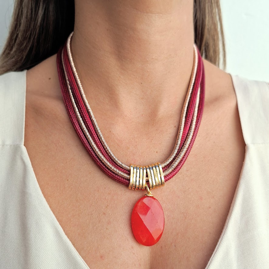 DESCRIÇÃO DO PRODUTO: Colar com fio encerado, fio metalizado, entremeios em alumínio banhado mais pedra oval em jade vermelha.