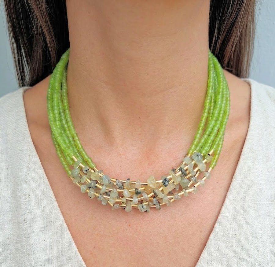 DESCRIÇÃO DO PRODUTO: Maxi colar com entremeios em alumínio banhado, miçangas em vidro mais cascalho de prehnita em pedra natural.