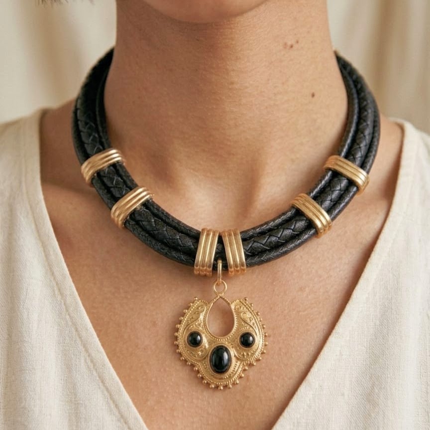 PEÇAS: Entremeios em alumínio banhado com banho em verniz suíço, fio encerado, fio em couro sintético mais detalhes no pingente em resina.