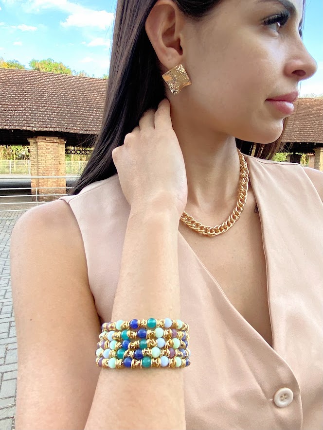 DESCRIÇÃO DO PRODUTO: Pulseira com correntes e elos em alumínio banhado, esferas em pedra natural olho de gato, cristal em vidro mais fecho imã.