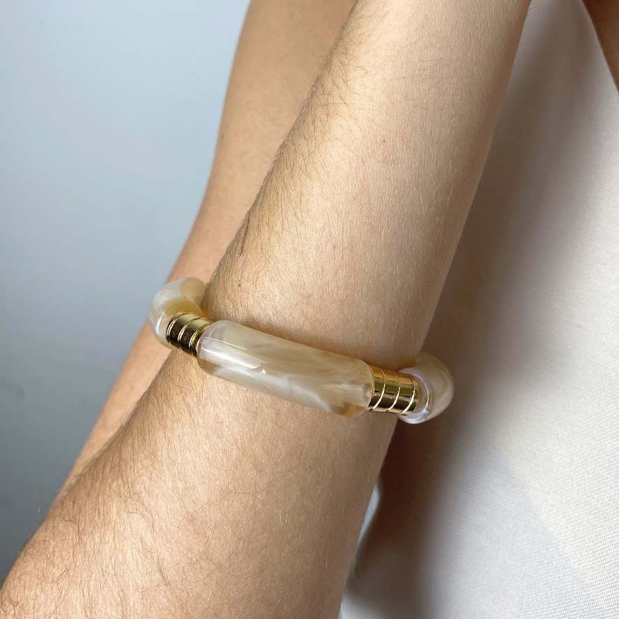 Pulseira em resina básica uma única volta mesclada. Essa é aquela peça que não pode faltar no seu acervo de acessórios.