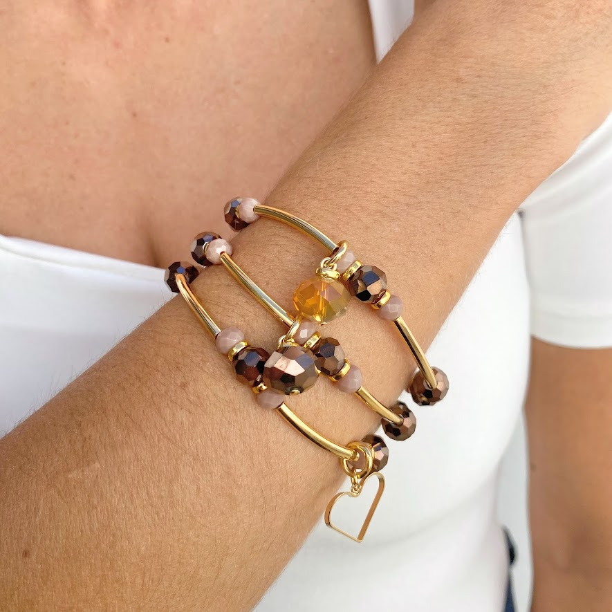 DESCRIÇÃO DO PRODUTO: Mix de pulseiras três voltas com entremeios em alumínio banhado mais cristais em vidro.